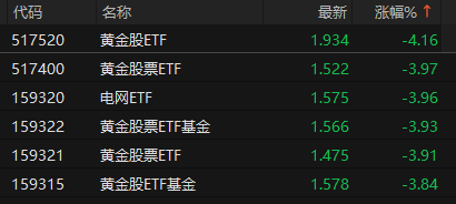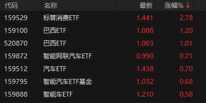 12月16日,ETF午间收盘涨跌不一,标普消费ETF(159529)领涨2.78%,巴西ETF(159100)涨1.20%,巴西ETF(520870)涨1.01%,黄金股ETF(517520)领跌4.16%,黄金股票ETF(517400)跌3.97%,电网ETF(159320)跌3.96%。