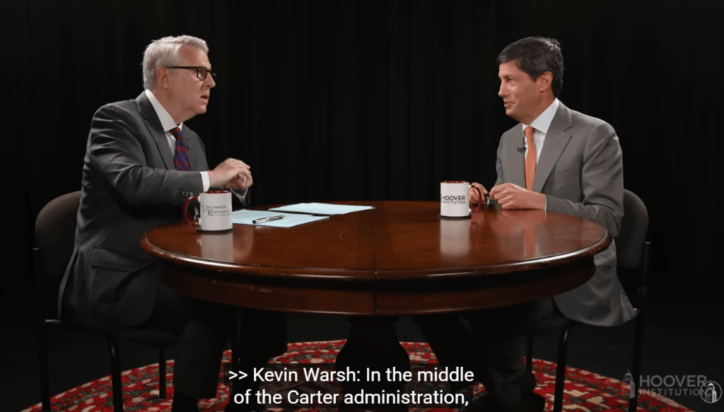 凯文,让我在结束时间你关于这个国家的两种愿景。让我用另外几句引语来铺垫。这是你,凯文·沃什说的:“大约40年来——这始于‘大稳健’时期,也就是从80年代中期开始——美国人几乎不考虑价格水平的变动。事情本该如此运作。我们可以认为这是理所当然的,因为聪明、勤奋的人们让国家的其他部分得以正常运转。”