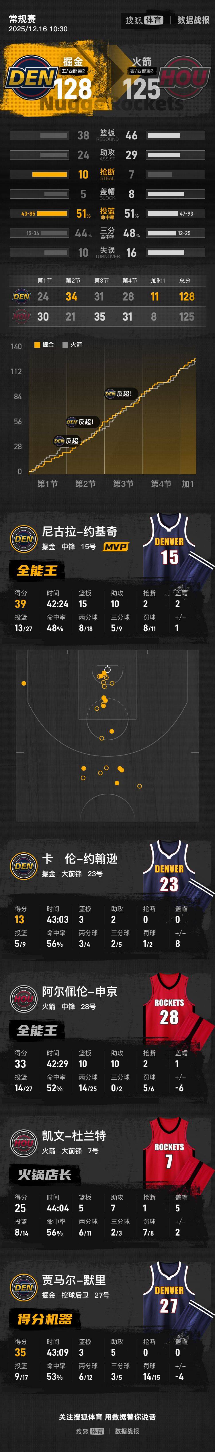 【搜狐体育战报】北京时间12月16日NBA常规赛,主场作战的掘金以128-125加时击败火箭,掘金取得5连胜。约基奇39分15篮板10助攻,申京33分10篮板10助攻。