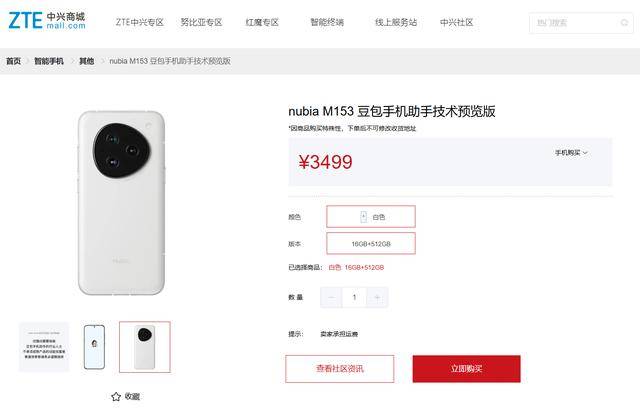 12月16日,根据中兴商城官网显示,豆包手机助手及合作机型nubiaM153目前已重启F码候补申请通道,正式恢复产品购买资格,16GB+512GB版本售价3499元。