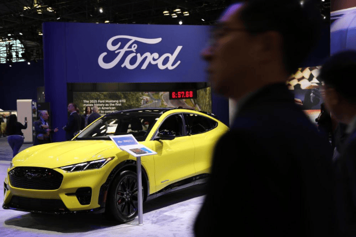4月16日,在美国纽约举行的2025年纽约国际车展上,参观者经过福特汽车展位。新华社