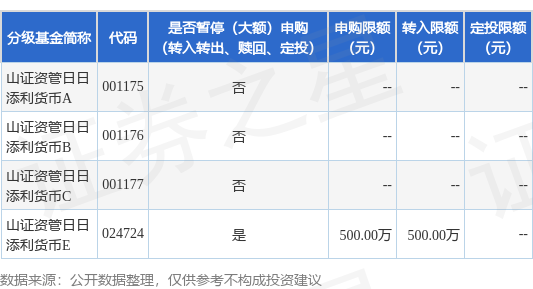 证券之星消息,12月17日山证(上海)资产管理有限公司发布《山证资管日日添利货币市场基金调整大额申购(转换转入、定期定额投资)限额的公告》。公告中提示,为保护投资者的利益,维护基金平稳运作,自2025年12月17日起山证资管日日添利货币市场基金调整大额申购(转换转入、定期定额投资)限额,下属分级基金调整明细如下:
