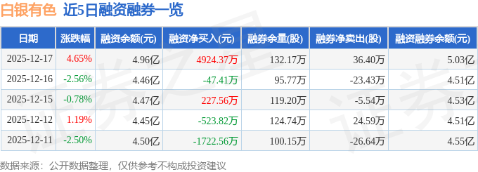 白银有色融资融券信息显示,融资方面,当日融资买入1.01亿元,融资偿还5183.98万元,融资净买入4924.37万元。融券方面,融券卖出47.76万股,融券偿还11.36万股,融券余量132.17万股,融券余额684.64万元。融资融券余额5.03亿元。