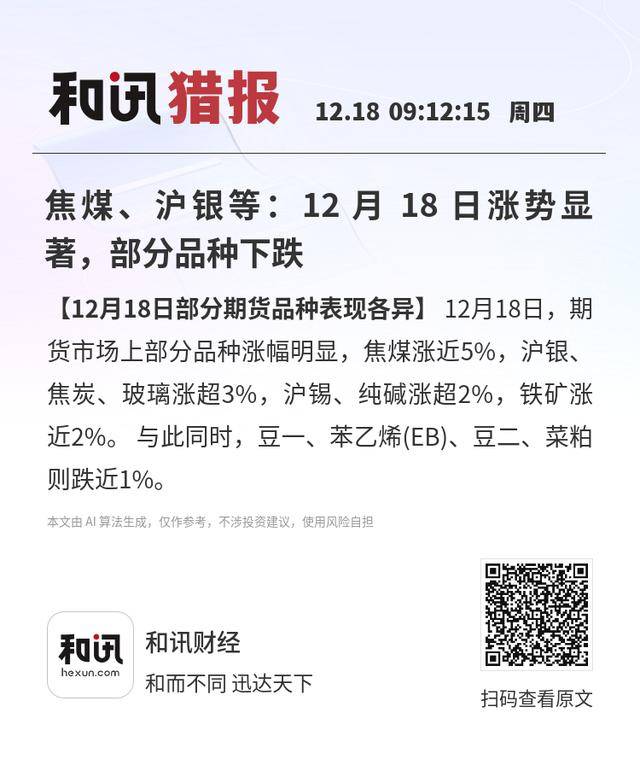 【12月18日部分期货品种表现各异】12月18日,期货市场上部分品种涨幅明显,焦煤涨近5%,沪银、焦炭、玻璃涨超3%,沪锡、纯碱涨超2%,铁矿涨近2%。与此同时,豆一、苯乙烯(EB)、豆二、菜粕则跌近1%。