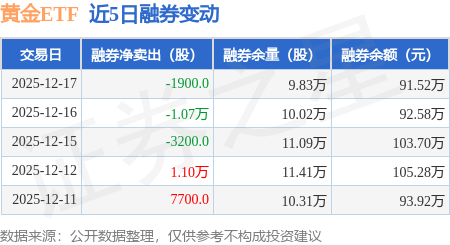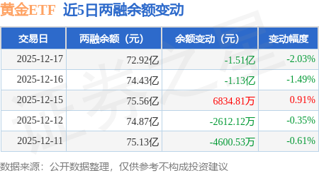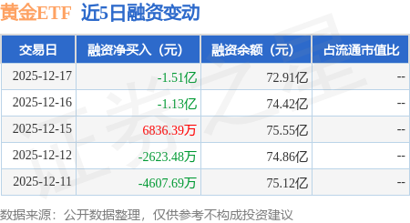 证券之星消息,12月17日,黄金ETF(518880)融资买入3.44亿元,融资偿还4.95亿元,融资净卖出1.51亿元,融资余额72.91亿元。