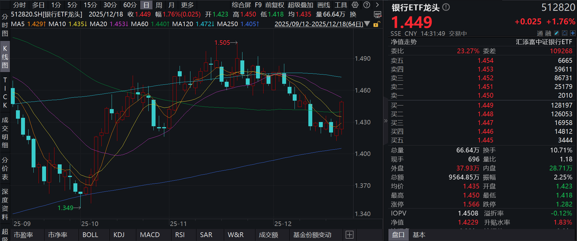 流动性方面,银行ETF龙头盘中换手10.25%,成交9151.29万元,市场交投活跃。拉长时间看,截至12月17日,银行ETF龙头近1月日均成交1.19亿元。