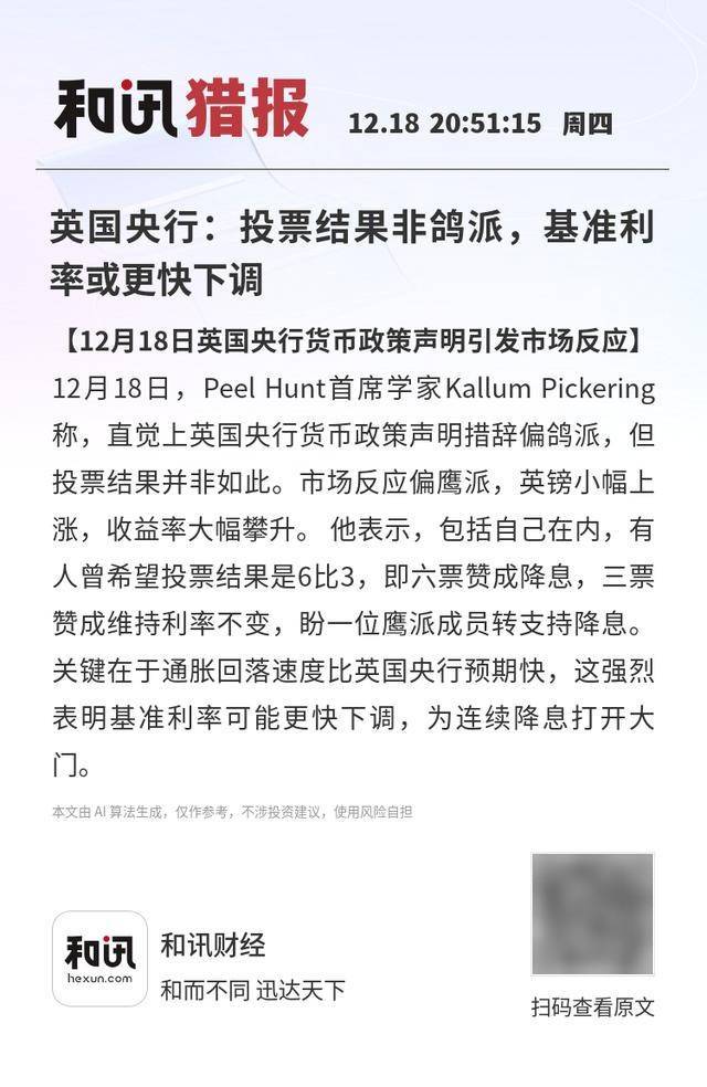 【12月18日英国央行货币政策声明引发市场反应】12月18日,Peel Hunt首席学家Kallum Pickering称,直觉上英国央行货币政策声明措辞偏鸽派,但投票结果并非如此。市场反应偏鹰派,英镑小幅上涨,收益率大幅攀升。 他表示,包括自己在内,有人曾希望投票结果是6比3,即六票赞成降息,三票赞成维持利率不变,盼一位鹰派成员转支持降息。关键在于通胀回落速度比英国央行预期快,这强烈表明基准利率可能更快下调,为连续降息打开大门。