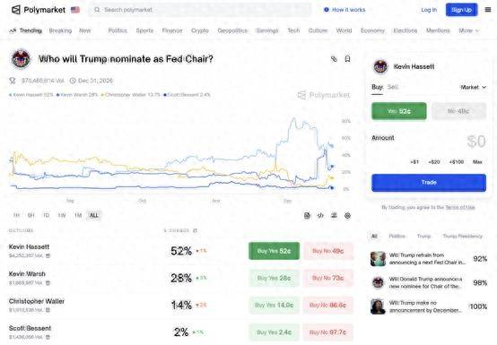 据最新数据,目前在美国预测市场Polymarket上,哈塞特被特朗普提名为美联储主席的概率仍然最高,为52%;其次是沃什,为28%;而沃勒排名第三,为14%。