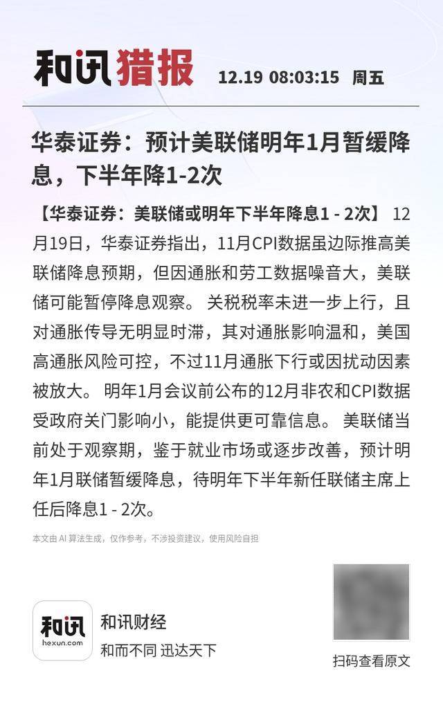 【华泰证券:美联储或明年下半年降息1 - 2次】12月19日,华泰证券指出,11月CPI数据虽边际推高美联储降息预期,但因通胀和劳工数据噪音大,美联储可能暂停降息观察。 关税税率未进一步上行,且对通胀传导无明显时滞,其对通胀影响温和,美国高通胀风险可控,不过11月通胀下行或因扰动因素被放大。 明年1月会议前公布的12月非农和CPI数据受政府关门影响小,能提供更可靠信息。 美联储当前处于观察期,鉴于就业市场或逐步改善,预计明年1月联储暂缓降息,待明年下半年新任联储主席上任后降息1 - 2次。