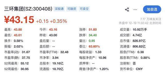 截至发稿时,三环集团A股报43.15元,涨0.35%,总市值约826.97亿元。