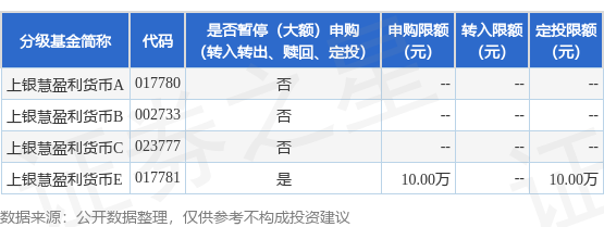 注:上银慧盈利货币A(交易代码:017780)以下简称“A类基金份额”,上银慧盈利货币B(交易代码:002733)以下简称“B类基金份额”,上银慧盈利货币C(交易代码:023777)以下简称“C类基金份额”,上银慧盈利货币E(交易代码:017781)以下简称“E类基金份额”。