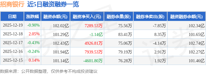 证券之星消息,截至2025年12月19日收盘,招商银行(600036)报收于41.99元,下跌0.9%,换手率0.28%,成交量57.38万手,成交额24.22亿元。