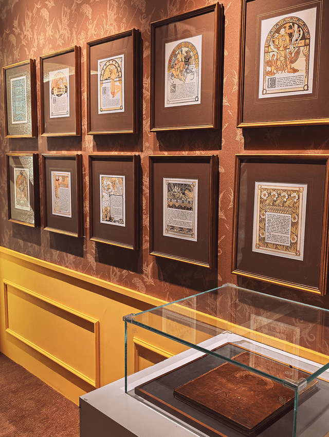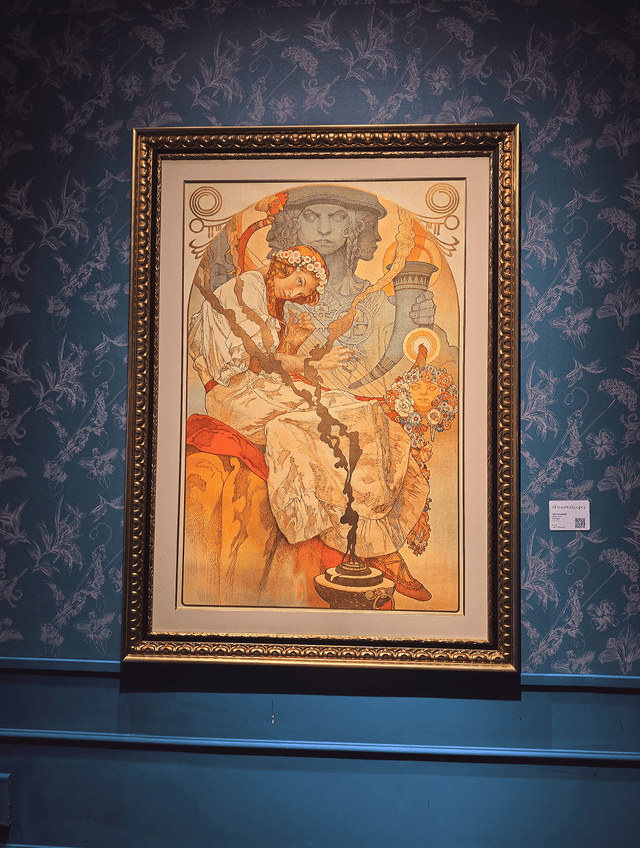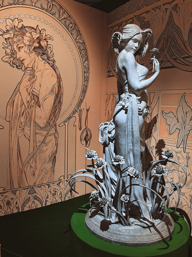 一进展厅就被满墙的曲线、鲜花和女神包围了!穆夏笔下的女性太美了,头发像藤蔓一样卷曲流淌,戴着月桂冠,被繁花簇拥着,每一幅都仙气飘飘,又充满力量。