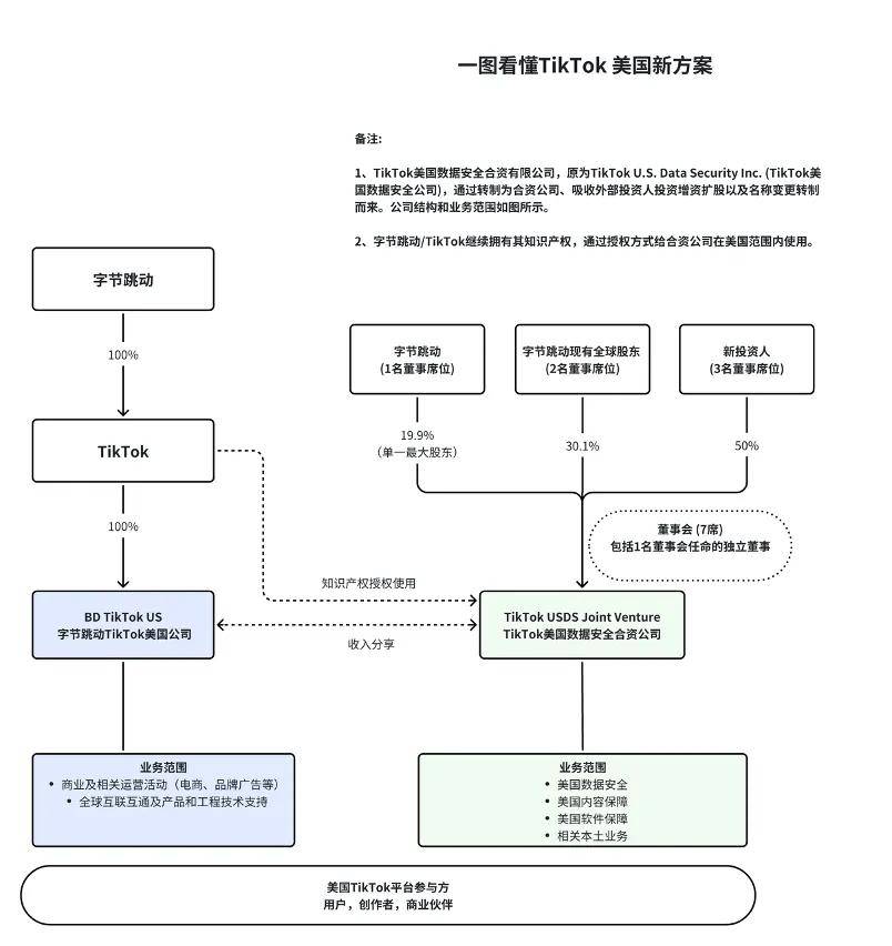 这家新公司被命名为 TikTok 美国数据安全合资有限责任公司(TikTok USDS Joint Venture LLC)。它的职责非常明确,负责美国用户的数据保护、算法安全、内容审核,以及软件层面的安全保障。换句话说,所有围绕安全、合规、监管的问题,都会被集中装进这个新主体里。