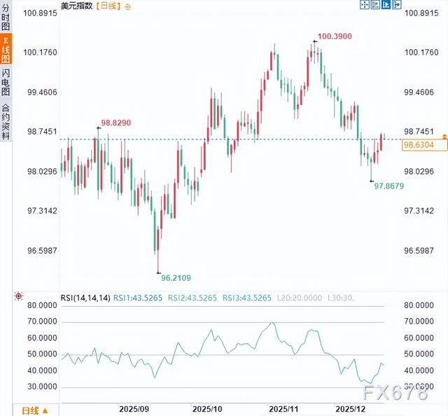 美元迷局:在政治角力与基本面之间摇摆 美元2026年走势将是“美联储政策路径”与“其他主要央行政策路径”之间相对优势的较量。美国经济因AI可能更具韧性,通胀更具粘性,这为美联储提供了比其他央行(如已开始降息的欧洲央行)更晚、更慢宽松的余地。这一相对优势,是当前环境下支撑美元的最主要逻辑。然而,政治干预风险和内部政策分歧是这一逻辑面临的最大威胁。周一亚市时段,美元指数于98.65附近窄幅震荡。