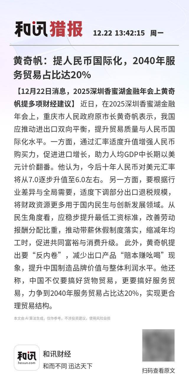 【12月22日消息,2025深圳香蜜湖金融年会上黄奇帆提多项财经建议】近日,在2025深圳香蜜湖金融年会上,重庆市人民政府原市长黄奇帆表示,我国应推动进出口双向平衡,提升贸易质量与人民币国际化水平。一方面,通过汇率适度升值增强人民币购买力,促进进口增长,助力人均GDP中长期以美元计价翻番。他认为,今后十年人民币对美元汇率将从7.0逐步升值至6.0左右。另一方面,要根据行业差异与全局需要,适度下调部分出口退税规模,将财政资源更多用于国内民生与创新发展领域。从民生角度看,应稳步提升最低工资标准,改善劳动报酬分配比重,推动带薪休假制度落实,缩减年均工时,促进共同富裕与消费升级。此外,黄奇帆提出要“反内卷”,减少出口产品“赔本赚吆喝”现象,提升中国制造品牌价值与整体利润水平。他还称,中国不仅要搞好货物贸易,更要搞好服务贸易,力争到2040年服务贸易占比达20%,实现更合理贸易结构。
