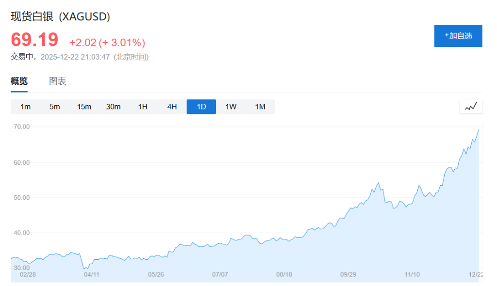 白银同样刷新历史新高,向70美元大关冲刺。