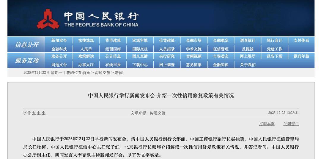 12月22日,中国人民银行发布关于实施“一次性信用修复政策”有关安排的通知,并举行新闻发布会介绍有关情况。政策明确,为支持信用受损但积极还款的个人高效便捷重塑信用,2020 年 1 月 1 日至 2025 年 12 月 31 日期间单笔不超 1 万元的逾期信息,若 2026 年 3 月 31 日前足额还款,征信系统将不予展示,且实行 “免申即享” 无需个人申请。