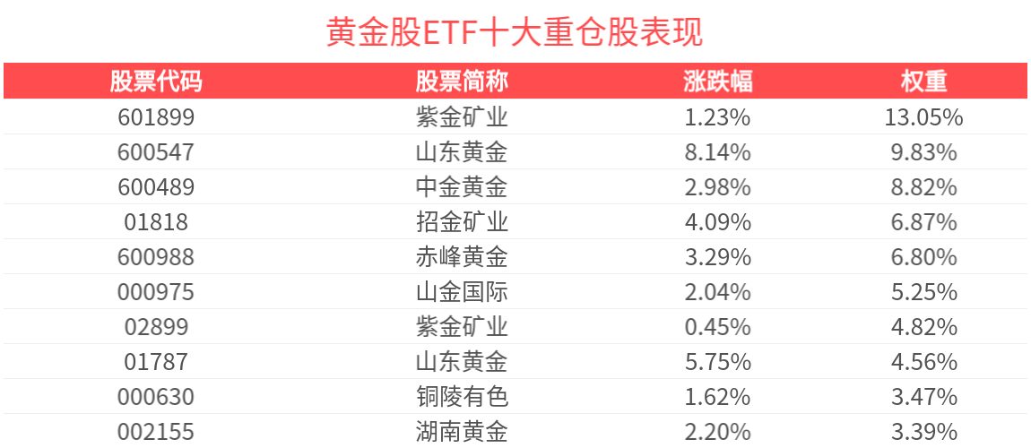 黄金股ETF紧密跟踪中证沪深港黄金产业股票指数,覆盖黄金采掘、冶炼、销售等行业龙头企业。截至2025年11月28日,指数前十大权重股分别为紫金矿业(601899)、山东黄金(600547)、中金黄金(600489)、赤峰黄金(600988)、招金矿业(01818)、山金国际(000975)、紫金矿业(02899)、山东黄金(01787)、湖南黄金(002155)、铜陵有色(000630),前十大权重股合计占比68.26%。