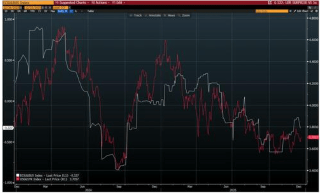 美国股票与债券市场正传递出截然不同的经济信号。Pasquariello指出,美国5年期国债收益率与美国劳动力市场数据的彭博意外指数保持紧密相关,显示债券市场主要锚定劳动力市场信号。