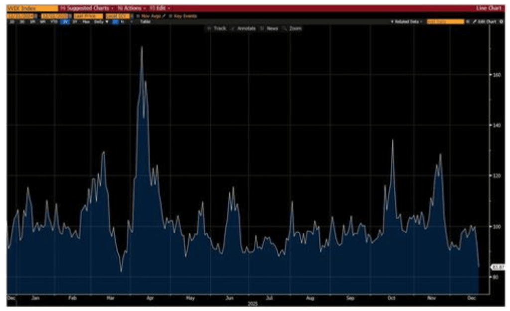 市场波动性方面,标普500指数的六个月实现波动率处于低位,印证了近期市场高分散度的运行特征。衡量市场恐慌情绪波动程度的VVIX指标,则勾勒出了2025年以来独特的市场情绪演变路径。