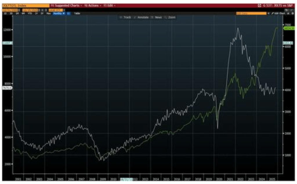另一个值得关注的背离出现在JOLTS职位空缺数据与标普500指数之间。这种多年来劳动力市场与股市之间的相关性可能在2025年被正式打破,这将是一个重要的结构性变化。