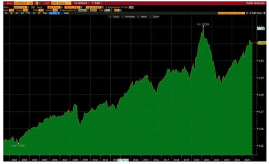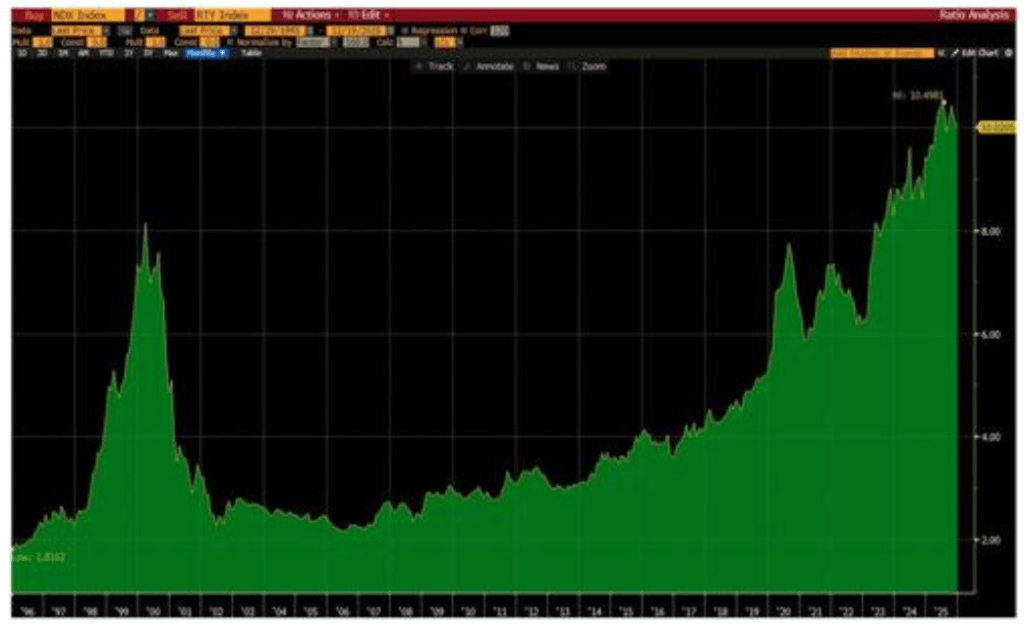 在美国市场内部,成长股与价值股的分化格局持续深化。纳斯达克100指数相对于罗素2000小盘股指数的比率不断攀升,延续了“强者恒强”的市场特征。Pasquariello分析指出,尽管在美联储潜在流动性支持下小盘股可能出现阶段性行情,但从结构性角度看,他并不认为小盘股能够持续跑赢以科技巨头为代表的大盘股。