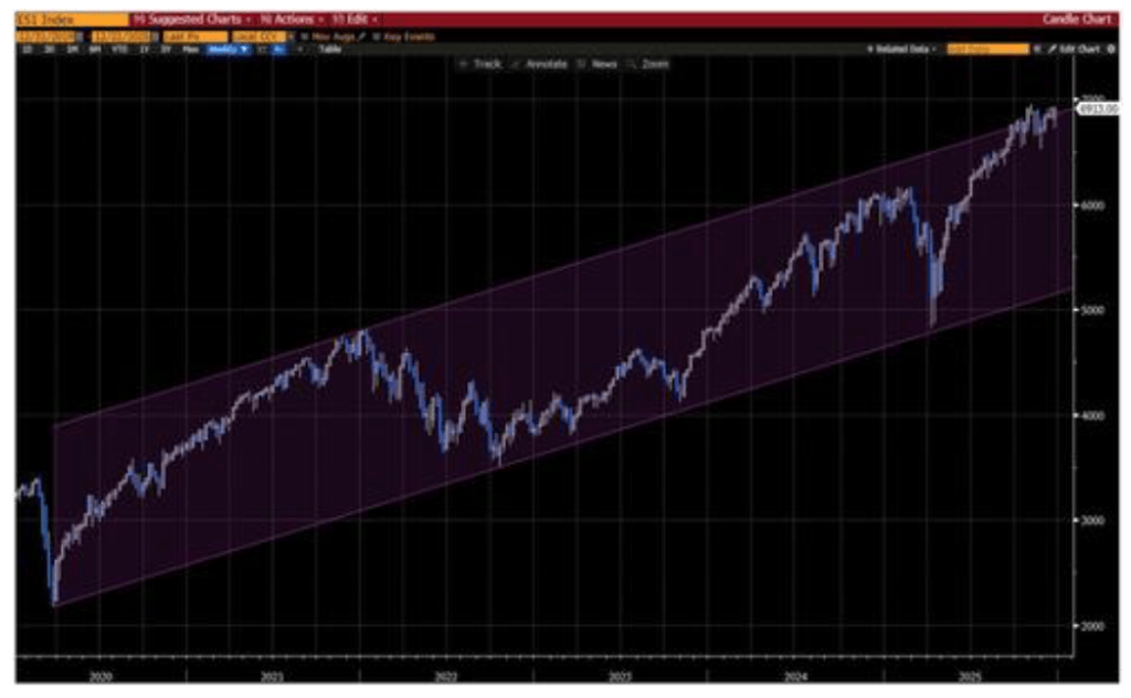Pasquariello最后以标普500指数自疫情低点以来的长期上升趋势作为分析结尾。尽管2025年市场再次经历了直觉与现实的考验,但美股最终仍延续了其长期上涨的轨迹。当前的关键问题在于,当指数逼近这一长期趋势通道的上沿时,市场的风险回报比将如何演变。