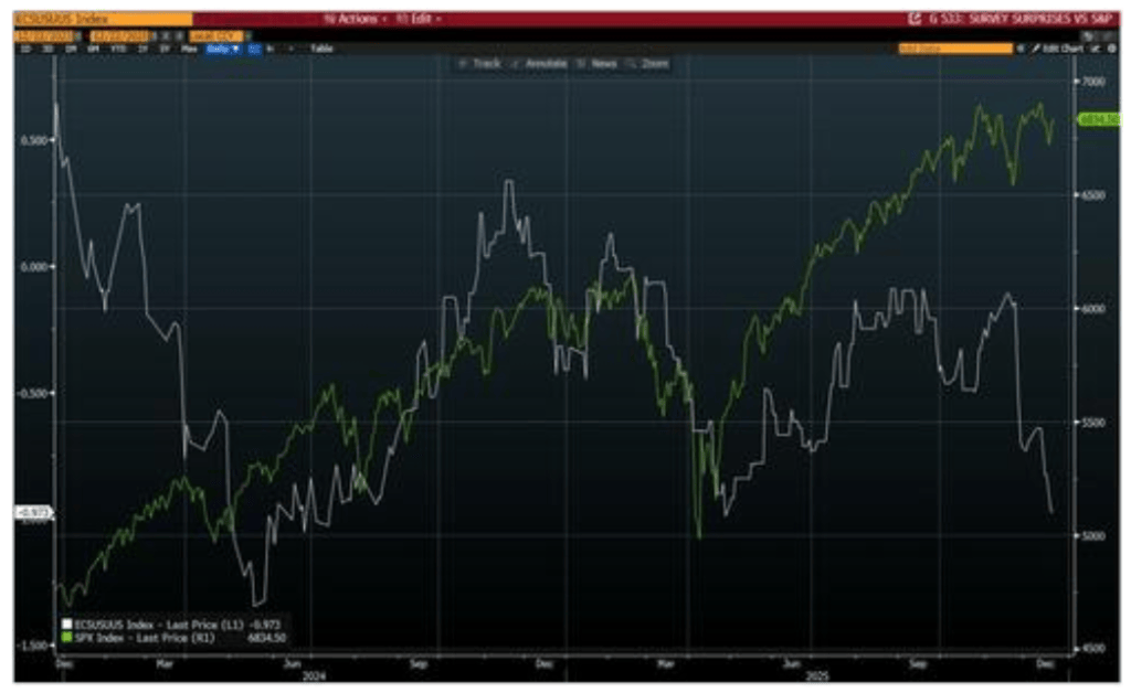 然而,股票市场(以标普500指数为代表)却呈现出另一番图景。它与商业调查及周期指标显著背离,正在提前定价一轮尚未在广泛数据中得到验证的“经济周期性加速”。Pasquariello强调,其观点并非判断股债孰对孰错,而是提示风险:若预期的2026年上半年经济加速未能实现,当前股市的乐观定价将面临调整压力。