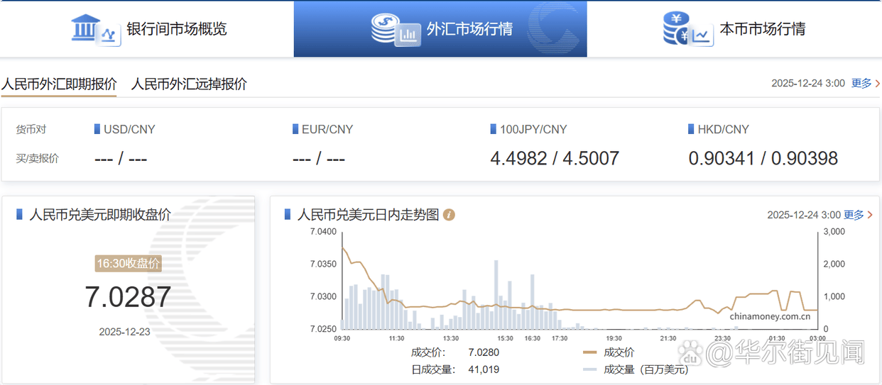 在岸人民币兑美元(CNY)北京时间03:00收报7.0280元,较周一夜盘收盘涨88点。成交量410.19亿美元。
