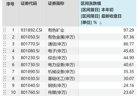 今年以来,有色板块持续领跑,年初以来至12月23日,申万一级有色金属指数涨幅87.36%,在31个申万一级行业指数中位居第一。矿业ETF(159690)跟踪的有色矿业指数年内涨幅达97.29%,弹性更为突出。