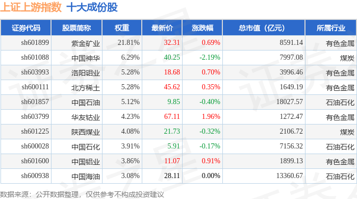 证券之星消息,12月24日,上证上游(000094)指数报收于4396.16点,涨0.13%,成交497.02亿元,换手率0.57%。当日该指数成份股中,上涨的有23家,白银有色以3.7%的涨幅领涨,下跌的有20家,厦门钨业以4.56%的跌幅领跌。