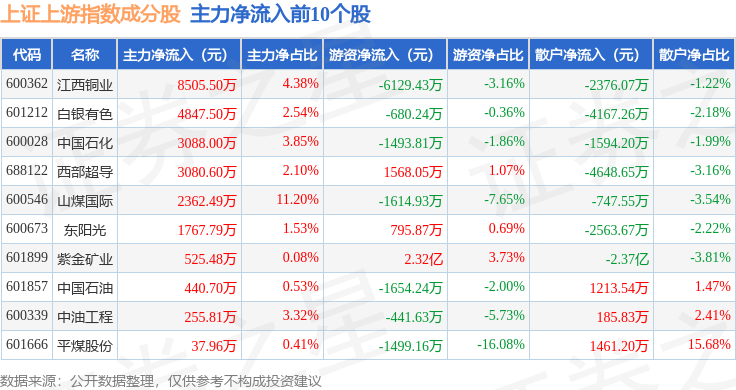 资金流向方面,上证上游(000094)指数成份股当日主力资金净流出合计15.8亿元,游资资金净流出合计2047.88万元,散户资金净流入合计16.01亿元。成份股资金流向详情见下表: