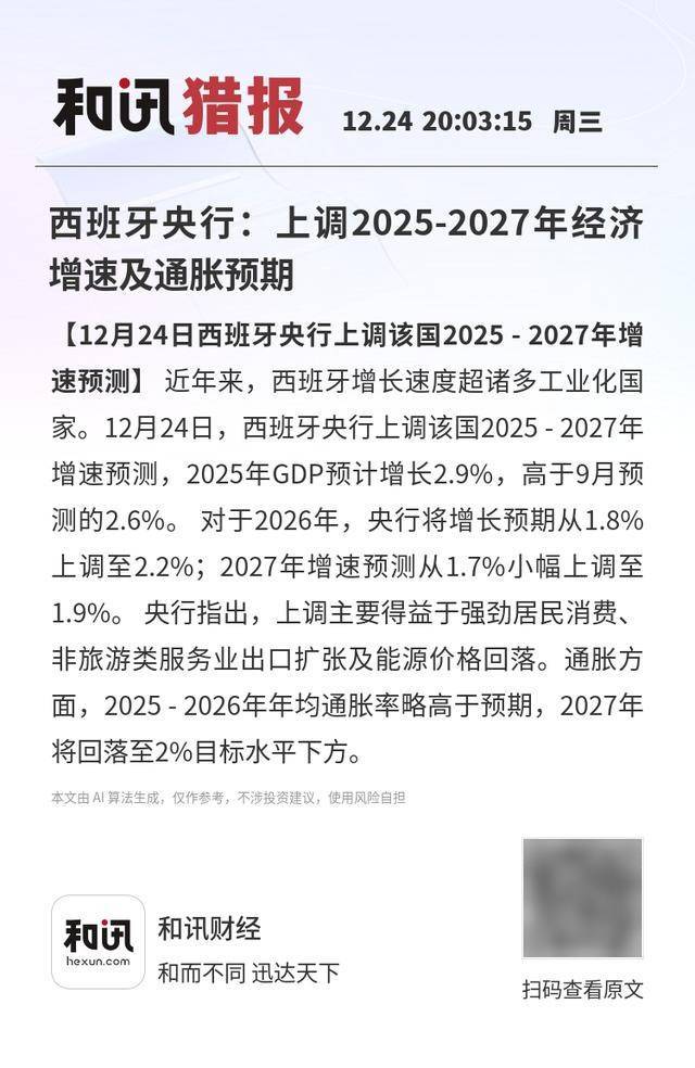 【12月24日西班牙央行上调该国2025 - 2027年增速预测】近年来,西班牙增长速度超诸多工业化国家。12月24日,西班牙央行上调该国2025 - 2027年增速预测,2025年GDP预计增长2.9%,高于9月预测的2.6%。对于2026年,央行将增长预期从1.8%上调至2.2%;2027年增速预测从1.7%小幅上调至1.9%。央行指出,上调主要得益于强劲居民消费、非旅游类服务业出口扩张及能源价格回落。通胀方面,2025 - 2026年年均通胀率略高于预期,2027年将回落至2%目标水平下方。