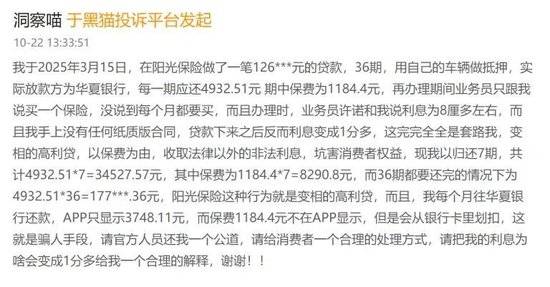 10月22日,另有消费者投诉称,其于3月在阳光保险办了一笔贷款,放款方为华夏银行,分36期,每期应还4932.51元,其中保费1184.4元。办理时,业务员许诺其利息为8厘多左右,没有任何纸质版合同,贷款下来之后利息却变成1分多,“这完完全全是套路我,变相的高利贷。”这名消费者说。