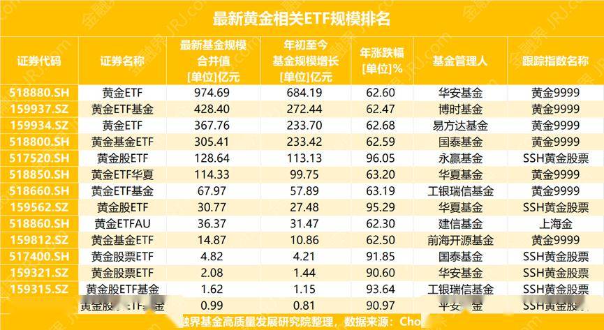 来自Choice金融终端的数据显示,截至12月23日,主流的黄金商品ETF年内集体上涨超过62%,而黄金股票ETF的涨幅更是集体超过90%。更引人注目的是规模的增长,所有黄金相关ETF的合并规模从年初水平增长了1771亿元,最新总规模已达到2478亿元。其中,规模超过百亿元的ETF产品有六只,包括华安黄金ETF、博时黄金ETF基金、易方达黄金ETF等,规模最大的华安黄金ETF已逼近千亿关口。