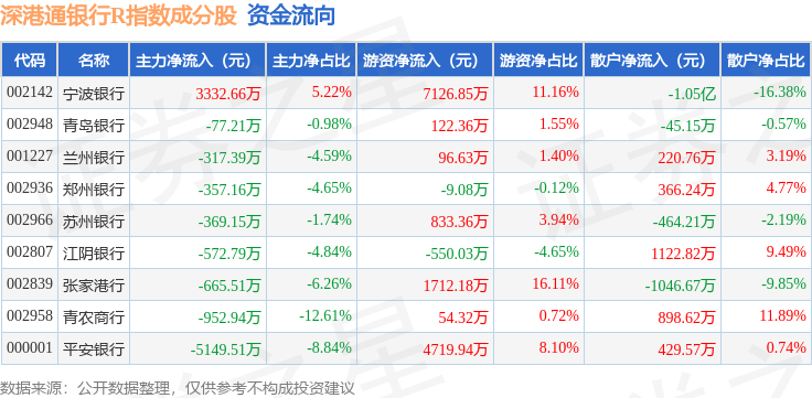 资金流向方面,深港通银行R(483081)指数成份股当日主力资金净流出合计5129.01万元,游资资金净流入合计1.41亿元,散户资金净流出合计8977.52万元。成份股资金流向详情见下表: