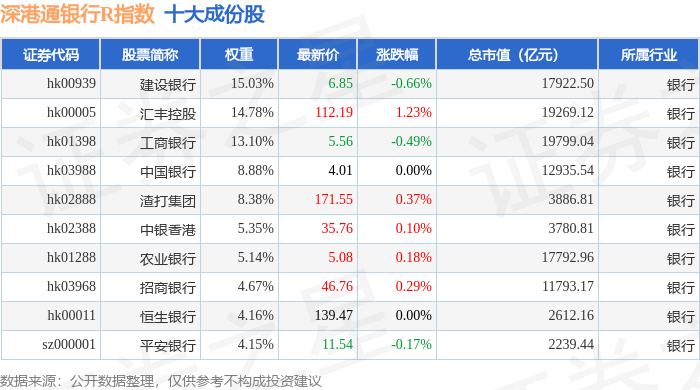 证券之星消息,12月24日,深港通银行R(483081)指数报收于12600.13点,跌0.1%,成交66.23亿元,换手率0.11%。当日该指数成份股中,上涨的有15家,汇丰控股以1.23%的涨幅领涨,下跌的有12家,青岛银行以1.28%的跌幅领跌。