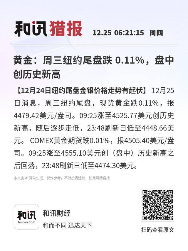 【12月24日纽约尾盘金银价格走势有起伏】12月25日消息,周三纽约尾盘,现货黄金跌0.11%,报4479.42美元/盎司。09:25涨至4525.77美元创历史新高,随后逐步走低,23:48刷新日低至4448.66美元。COMEX黄金期货跌0.01%,报4505.40美元/盎司。09:25涨至4555.10美元创(盘中)历史新高之后回落,23:48刷新日低至4474.30美元。
