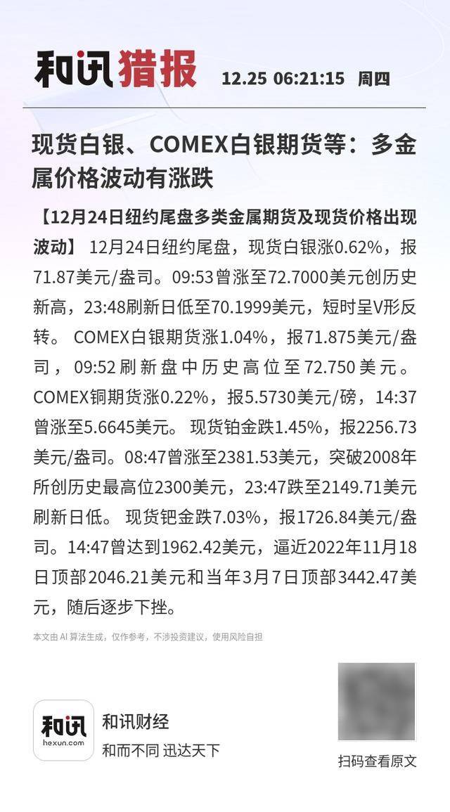 【12月24日纽约尾盘多类金属期货及现货价格出现波动】12月24日纽约尾盘,现货白银涨0.62%,报71.87美元/盎司。09:53曾涨至72.7000美元创历史新高,23:48刷新日低至70.1999美元,短时呈V形反转。COMEX白银期货涨1.04%,报71.875美元/盎司,09:52刷新盘中历史高位至72.750美元。COMEX铜期货涨0.22%,报5.5730美元/磅,14:37曾涨至5.6645美元。现货铂金跌1.45%,报2256.73美元/盎司。08:47曾涨至2381.53美元,突破2008年所创历史最高位2300美元,23:47跌至2149.71美元刷新日低。现货钯金跌7.03%,报1726.84美元/盎司。14:47曾达到1962.42美元,逼近2022年11月18日顶部2046.21美元和当年3月7日顶部3442.47美元,随后逐步下挫。