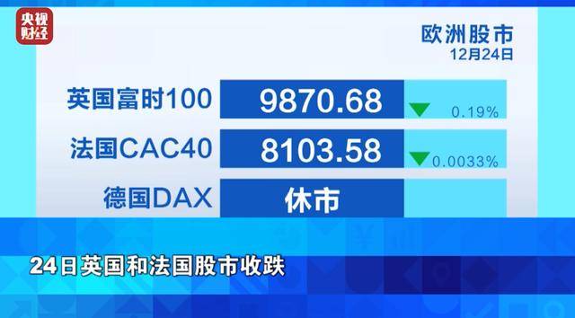欧洲方面,欧洲部分国家股市休市,多国股市因传统节假日提前结束交易,市场交投较为清淡,部分零售、非必需消费品蓝筹股表现不佳,英国和法国股市收跌,德国股市当天休市。截至收盘,英国股市跌0.19%,法国股市微跌0.0033%。