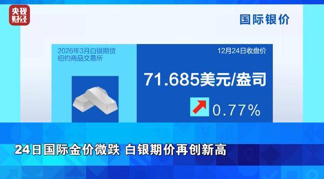 白银期价周三延续强劲涨势,连续第四个交易日创下历史新高,截至收盘,纽约商品交易所明年3月交割的白银期价收于每盎司71.685美元,涨幅为0.77%。有分析人士指出,银价上涨受到美联储降息、工业需求与投资需求增加等因素推动,不过,银价快速攀升过程中包含大量投机头寸,投资者需警惕银价短线大幅回调的风险。