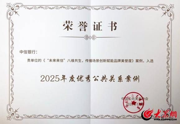 近日,2025年中国公共关系发展大会在北京举行。中信银行“未来来信”整合品牌营销活动荣获“2025年度优秀公共关系案例”。这是中信银行自2024年后蝉联此项荣誉,彰显其品牌建设与创新实践再次获得行业高度认可。