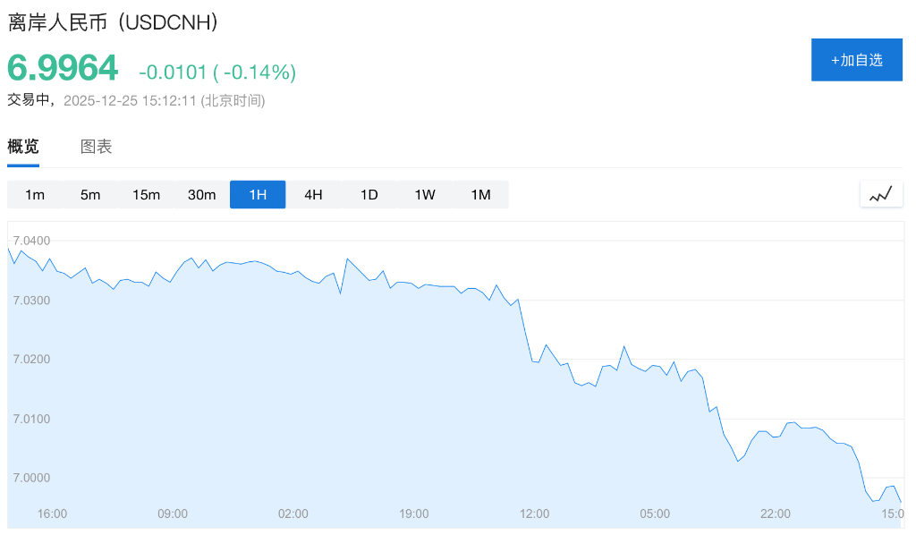 离岸人民币兑美元升破7.0关口,为2024年9月底以来首次;日元反弹至155.8附近