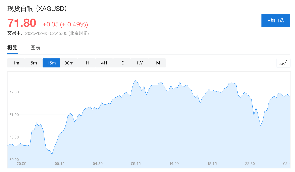 现货黄金跌超0.1%回落至4479美元/盎司;现货白银维持在71.80美元/盎司;布伦特原油下跌0.05%至61.84美元/桶