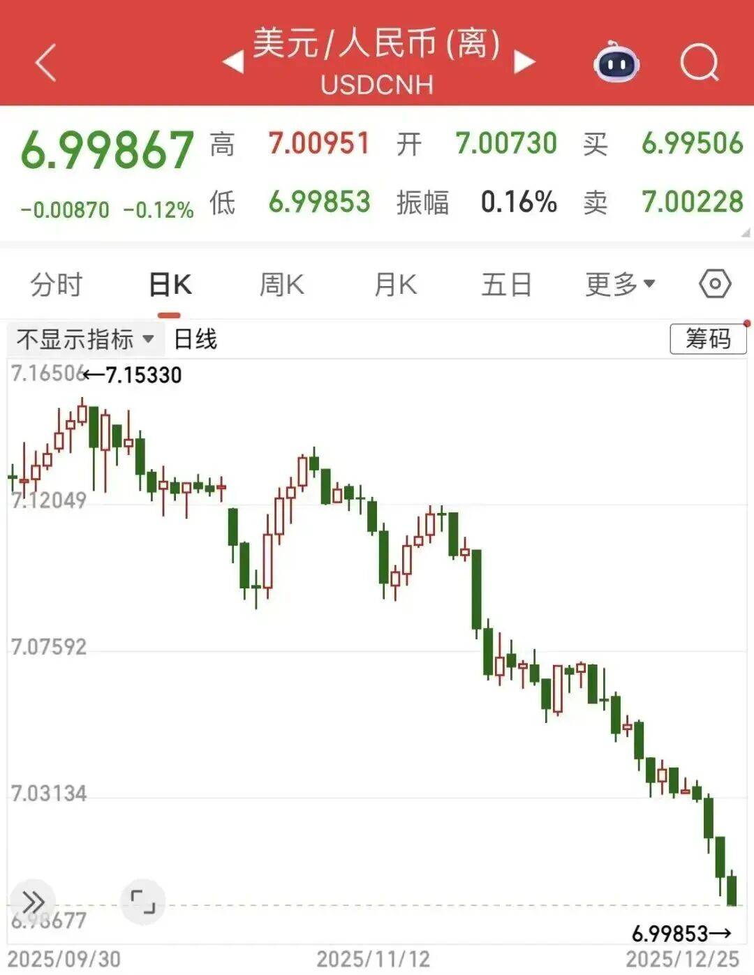 今天(12月25日),离岸人民币兑美元升破7.0大关。最高触及6.9985,为2024年以来首次。在岸人民币兑美元也升破7.01关口,创2024年9月27日以来新高。