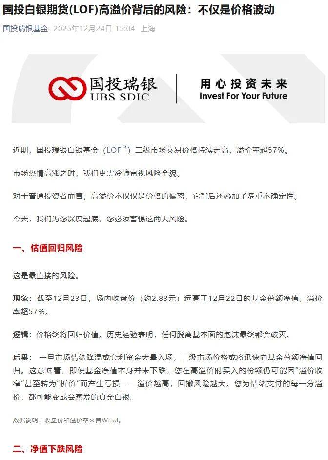 12月24日,国投瑞银基金官方公众号发文称,“高溢价背后的风险:不仅是价格波动”。