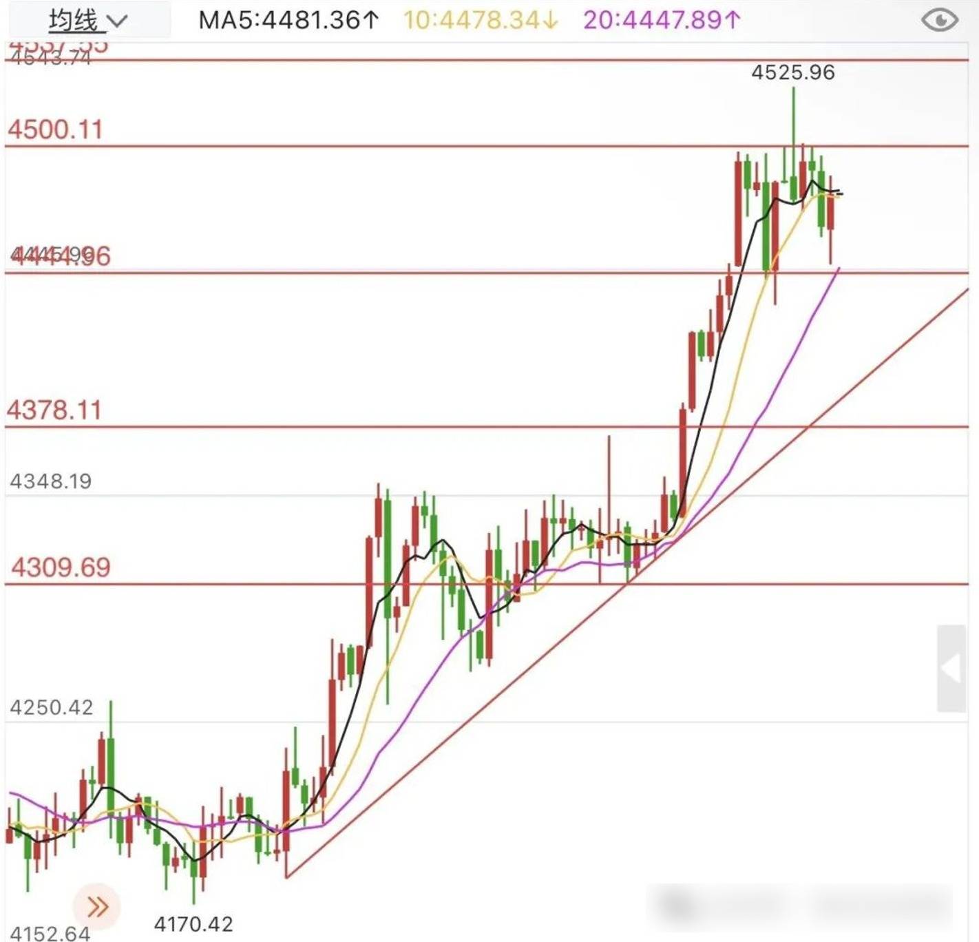 今天本周最后一个交易日,周二周三黄金新高后均伴随不同程度的跳水。今日早间开盘后,黄金若不破4455-45区域,则区域以上保持多头强势,下破则短线转弱;一切回落不破4370-80区域多头趋势为主,下破则行情转空。上方关注冲击4500美元大关,然后4525-30区域以及4550-60美元;在看涨的同时,依旧防范盘中跳水!