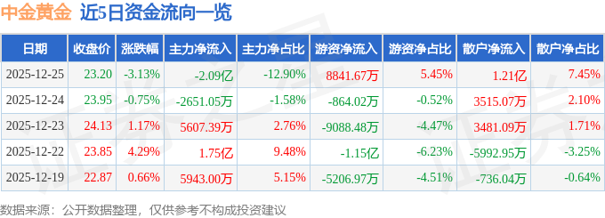 中金黄金(600489)12月25日主力资金净卖出2.09亿元