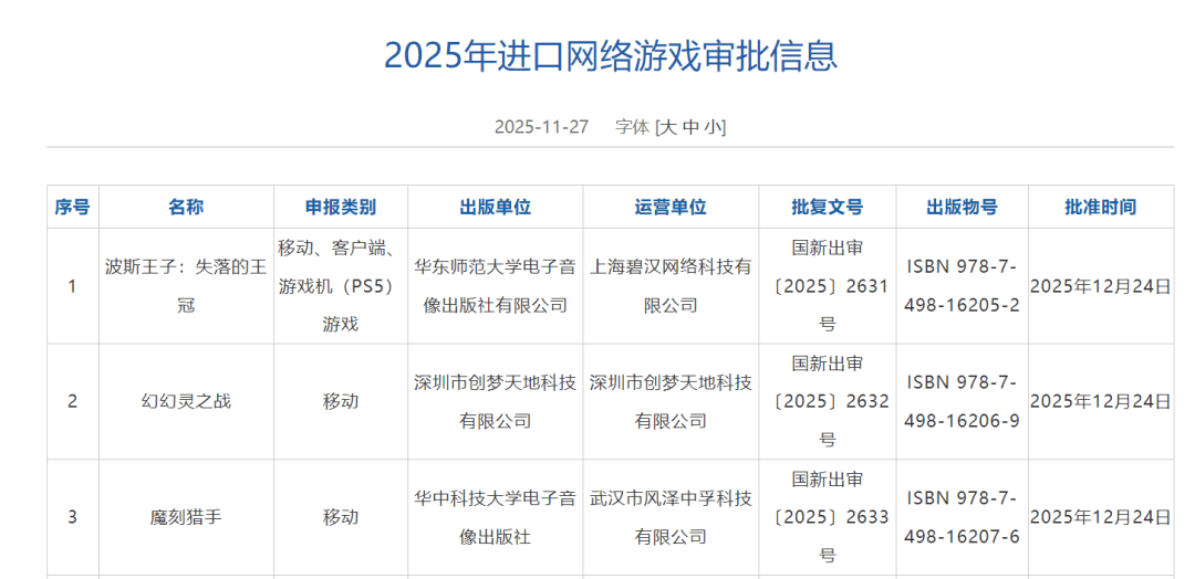 今日(12月25号),国家版署下发过审游戏版号共计147款,其中国产网络游戏144款,进口网络游戏3款。移动端游戏共143款,客户端游戏10款,主机游戏1款。